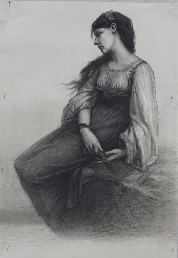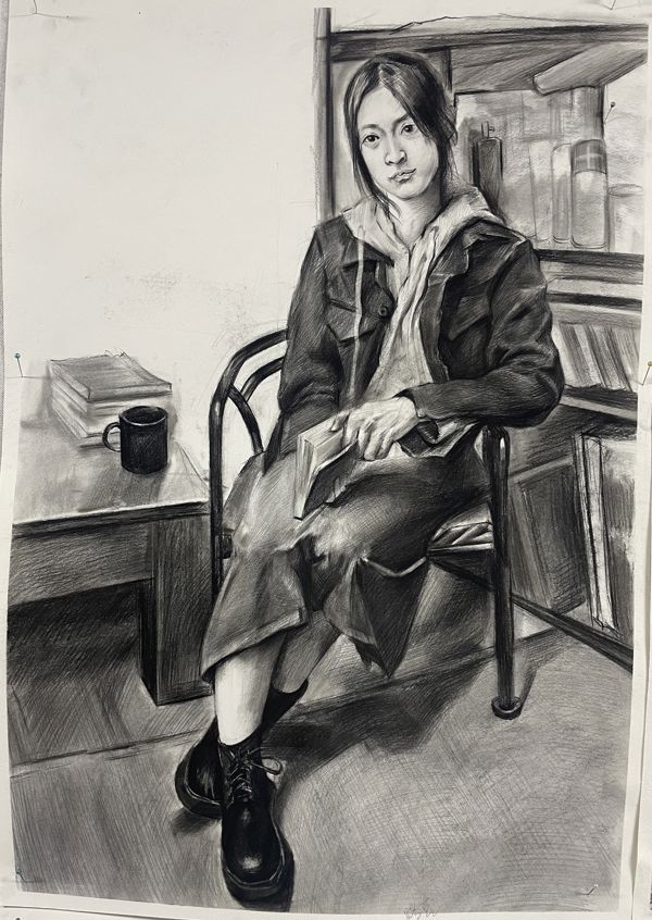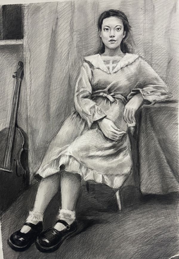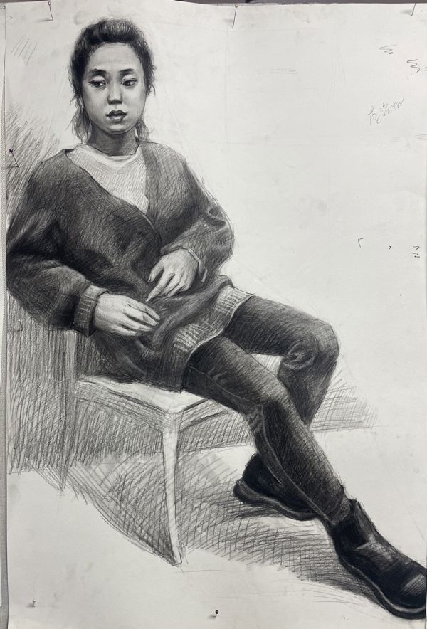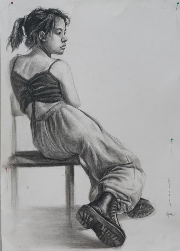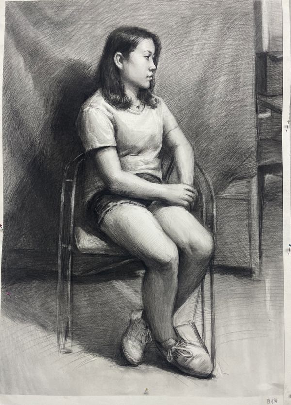 背景幕布、椅子与人物臀部的黑白灰关系处理的不错,手臂与腿也把模特的体型特点表现的很到位