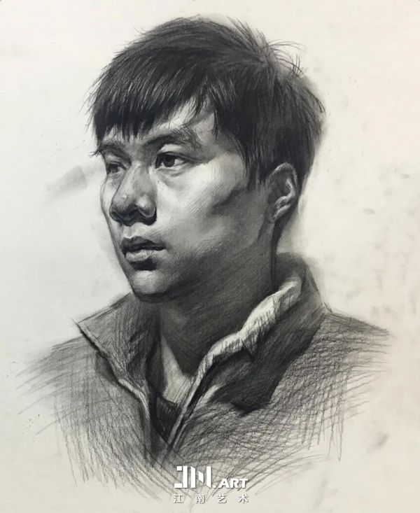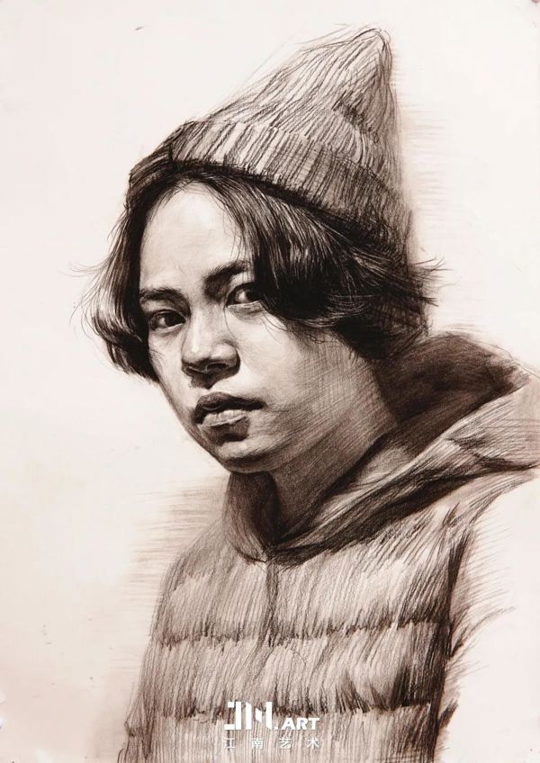 素描半身像,笔触与擦揉的技术法把羽绒服的细节表现的很好