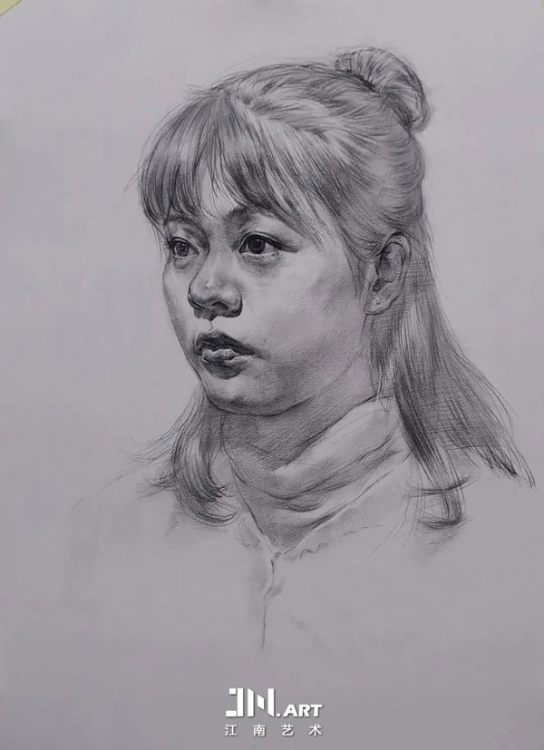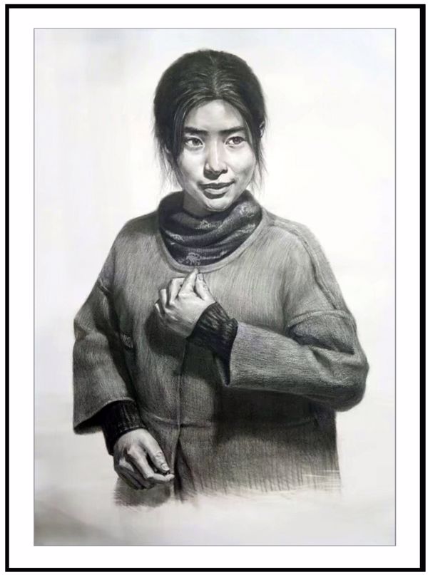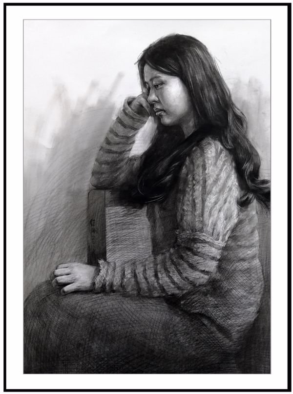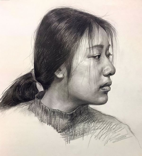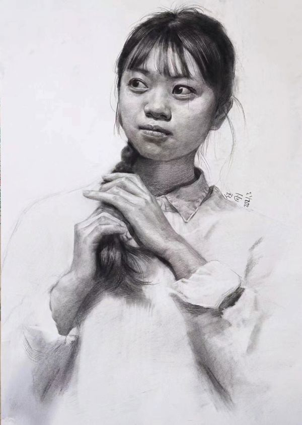 素描女青年形象生动氛围感满满有邻家女孩的亲切。画者大胆的使用大面积背景来衬托女孩皮肤衣服白皙的质感,也是自信得体现